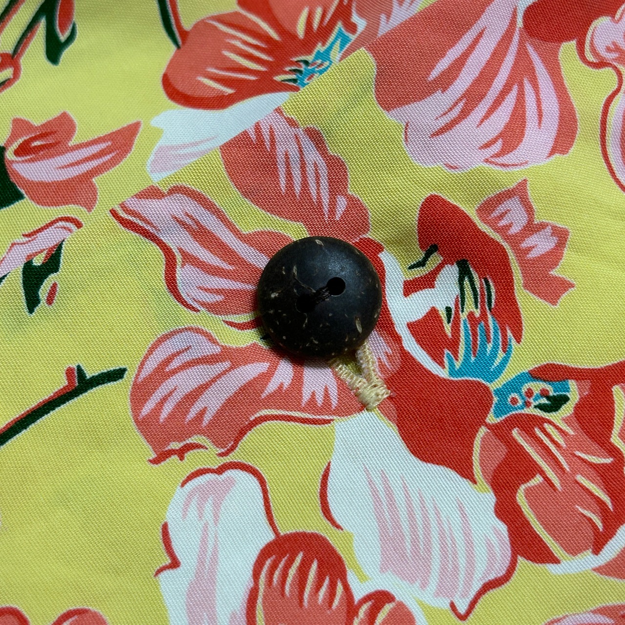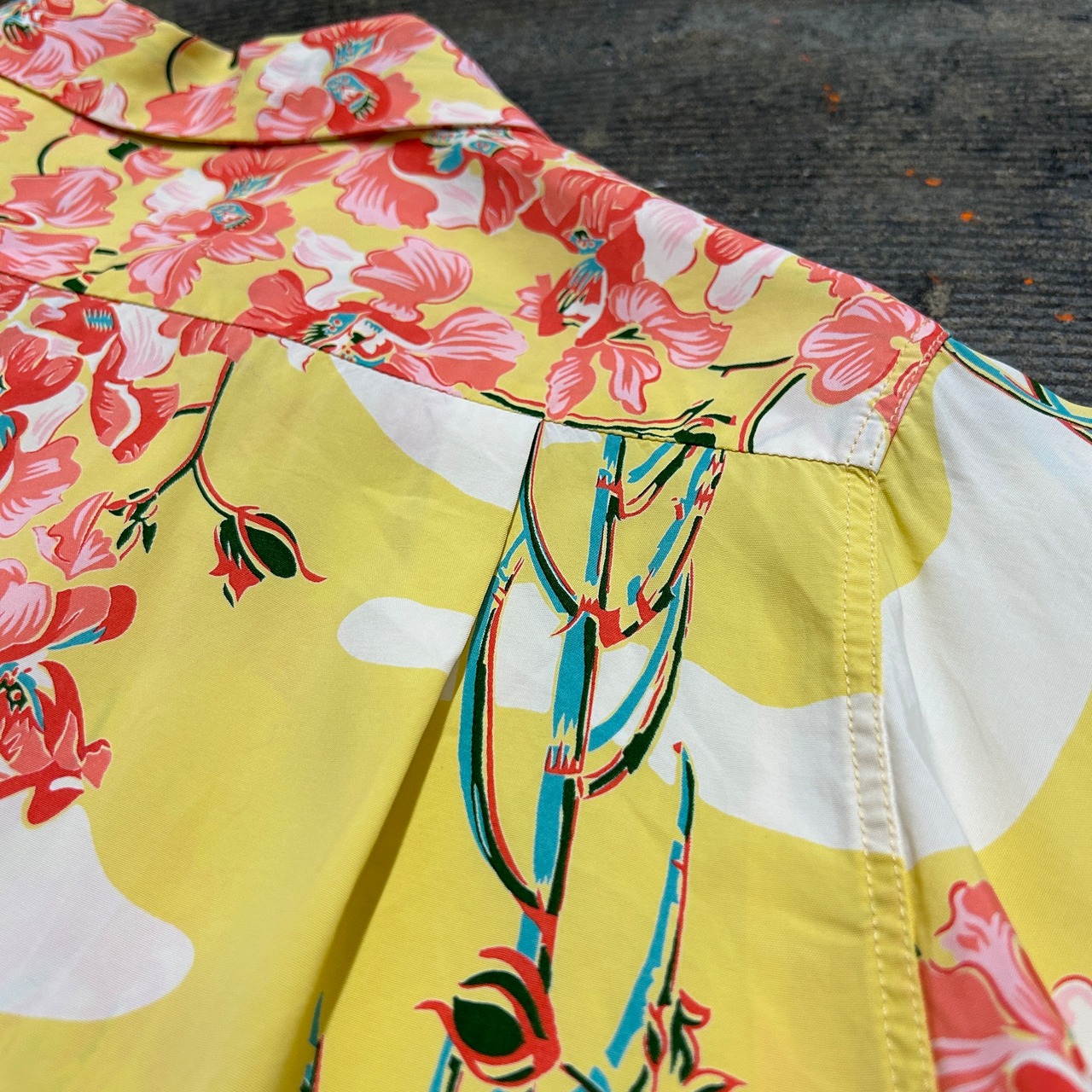 鮮やかなイエローベースに、トロピカルな蘭の花が全体に描かれた一枚。両サイドにはボーダー状の柄も入り、ヴィンテージアロハの雰囲気をしっかり再現した存在感のあるデザインです。